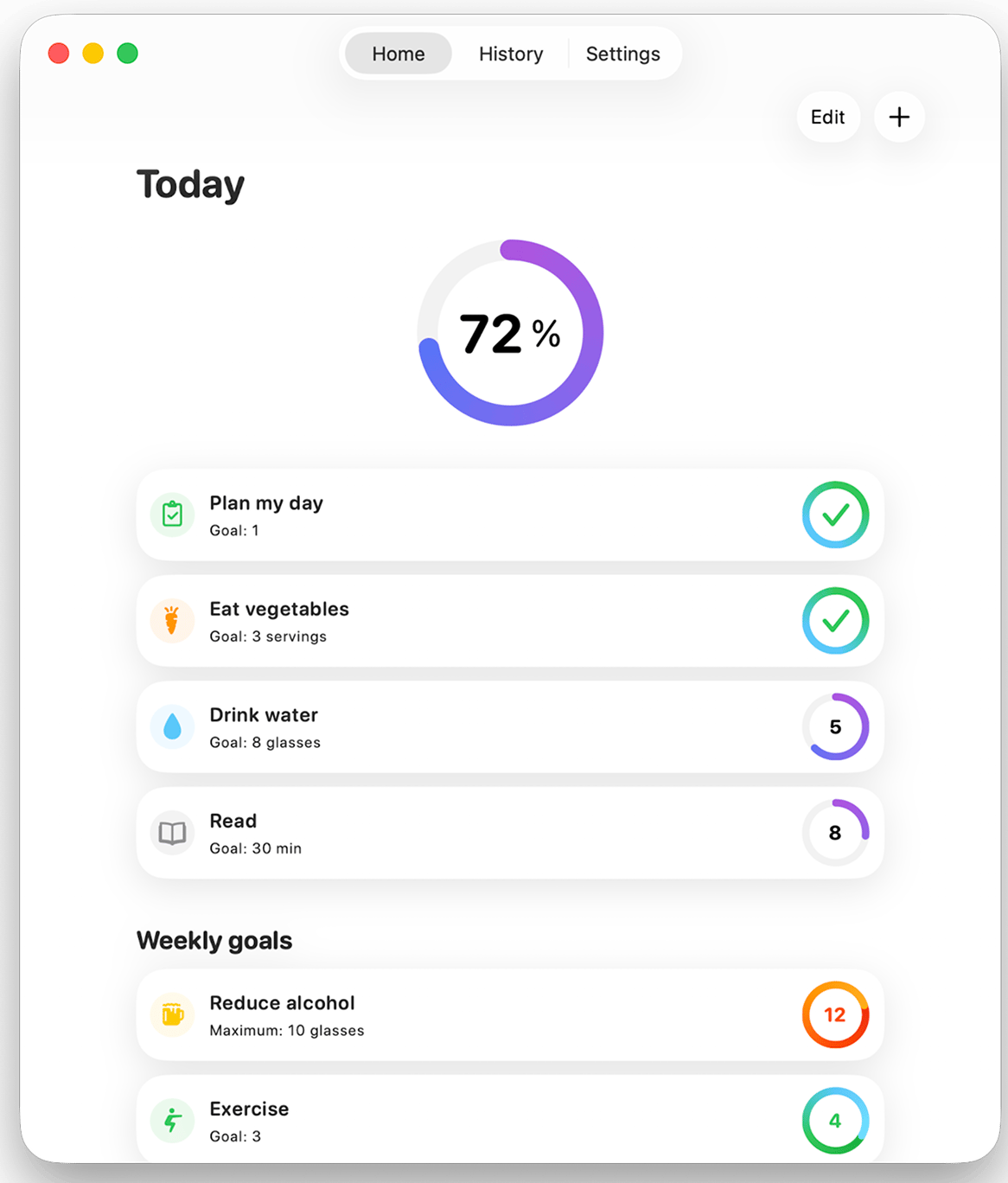 Change happens through small, consistent actions. Track them in Awesome Habits — hydration, reading, workouts, whatever matters. Seeing streaks build makes habits stick.