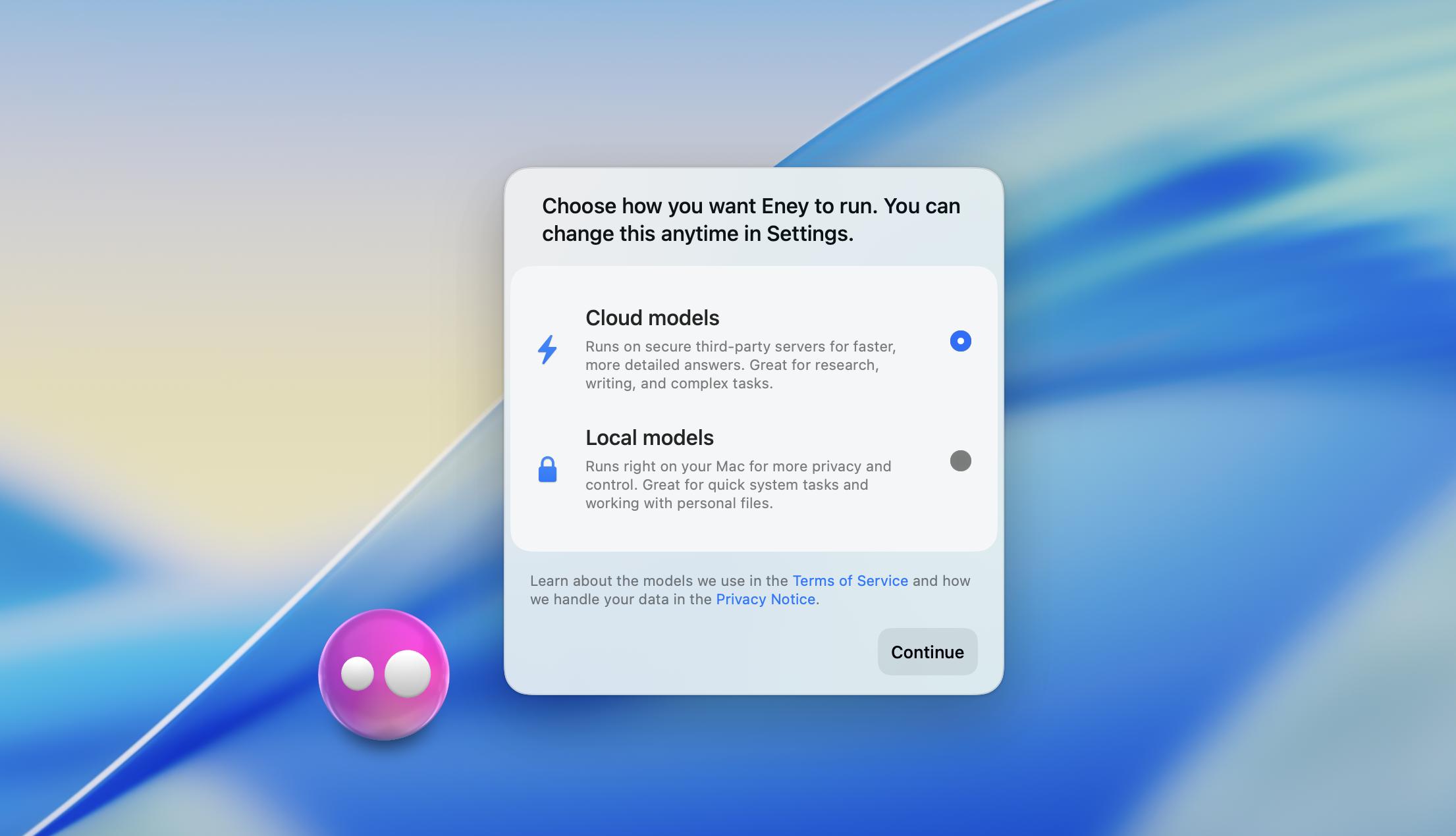 Eney runs locally for quick tasks and personal files. Switch to secure cloud when you need more power: research, long writing, complex questions. Flip it anytime in preferences.