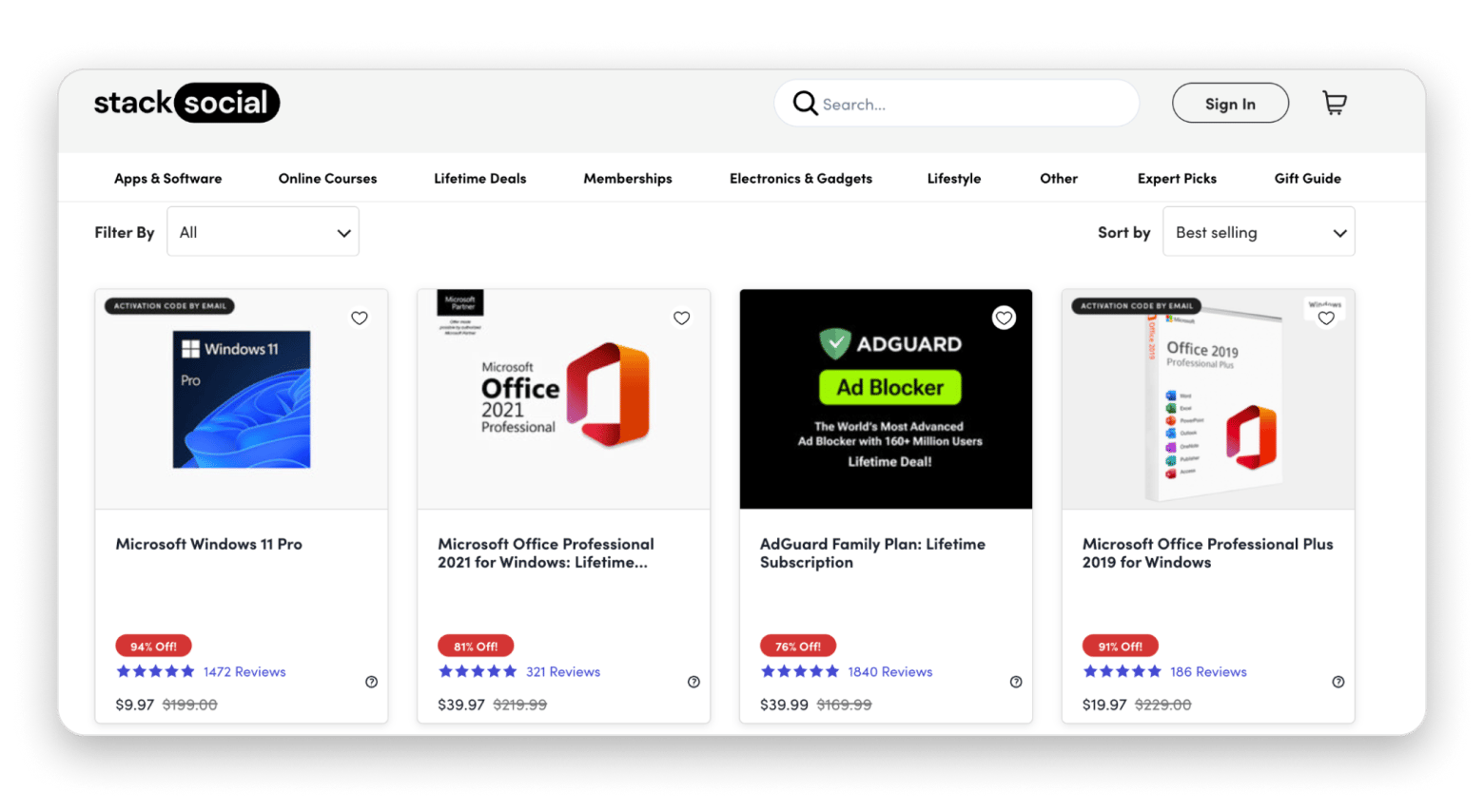 - StackSocial specializes in lifetime deals and discounted one-time payments. Ideal if you love snagging deep discounts on big-name apps. You pay once and keep the app forever, which makes it perfect for building a long-term toolkit without worrying about renewals.