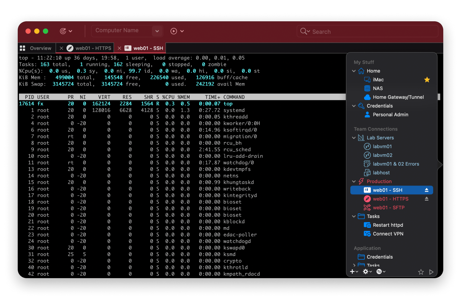 I use Royal TSX when I need a full remote access manager built for Mac. It offers centralized credential management and allows you to assign and reuse credentials across sessions and folders. You also get access to Secure Gateway support for SSH-based tunneling and dynamic folders for importing external data.