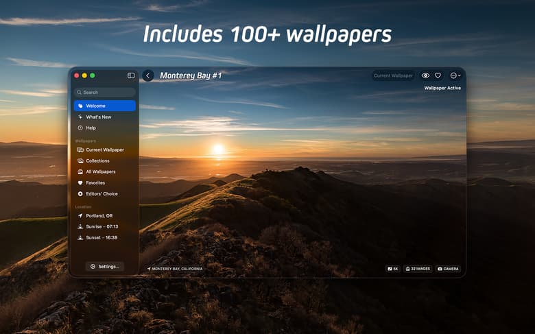 No more grainy and blurred wallpapers — all photos are available at 5K resolution. In total, the app includes desktop wallpapers containing more than 30 5K still images each. In case you want to save disk space, 24 Hour Wallpaper supports all resolution displays and offers lower resolution options.