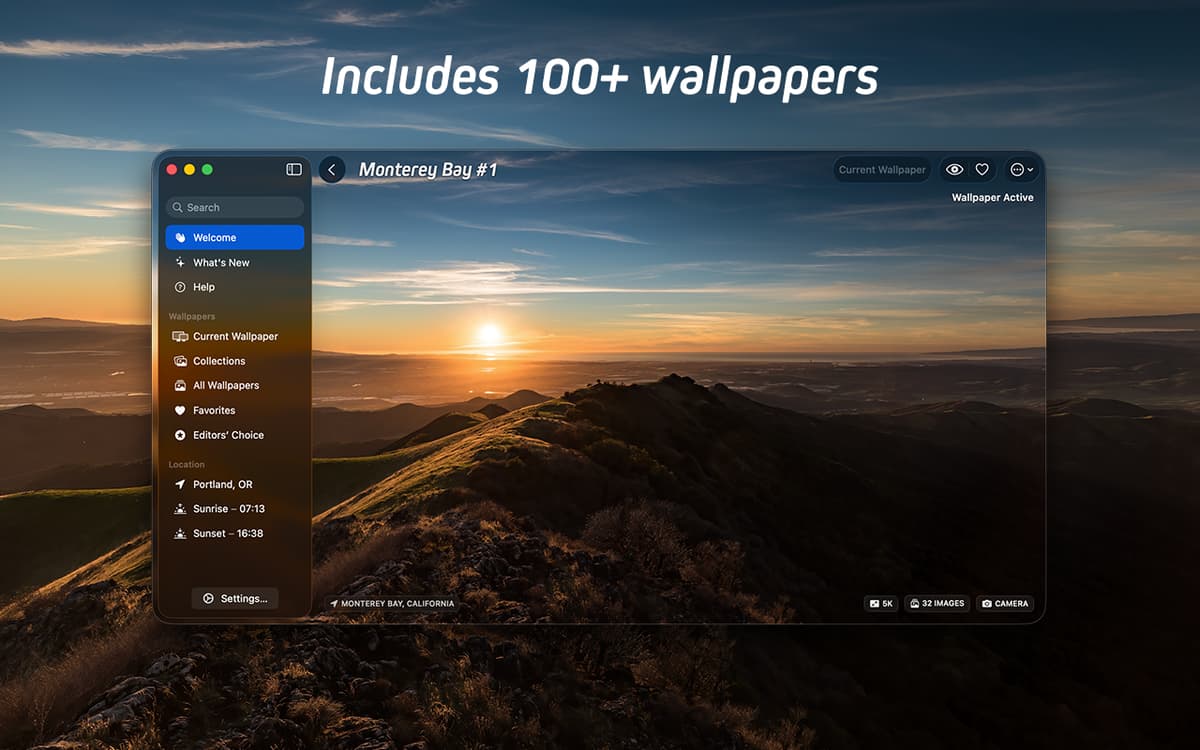 Customize your Mac desktop with 24 Hour Wallpaper, a wide selection of professionally captured wallpapers that change according to your time. From charming sunrises to beautiful night city lights — you can take anything to your Mac screen. 24 Hour Wallpaper has a unique collection of nature and city photos, for you to personalize your Mac desktop with selected sceneries.