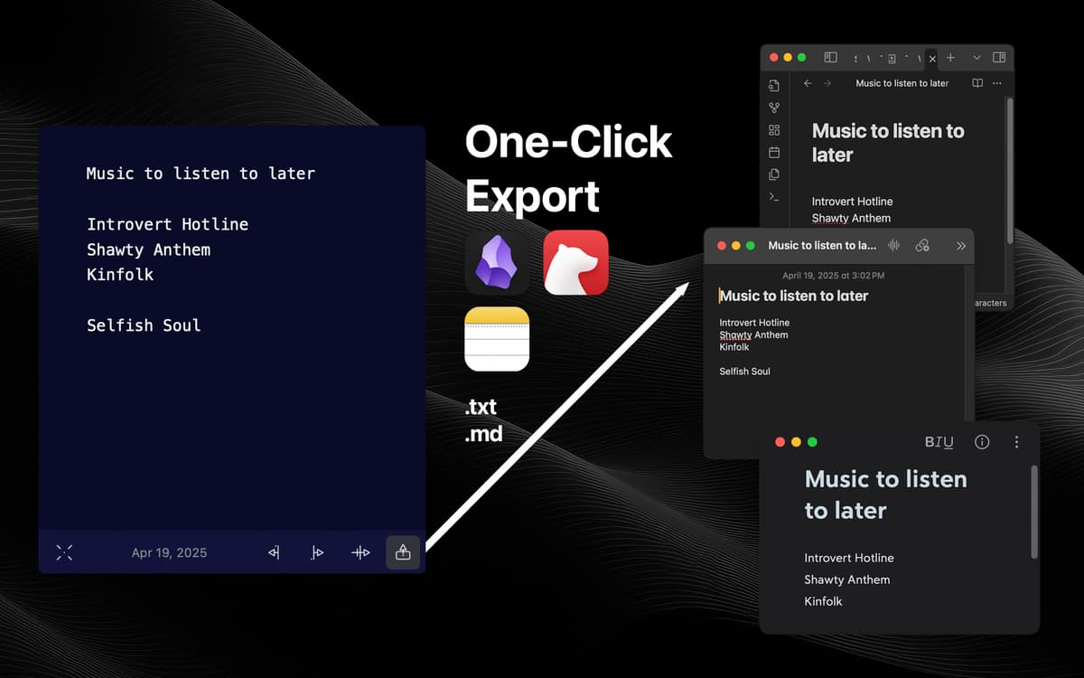 Got a screenshot with some text you want to copy? No need for a separate OCR tool! Just drag and drop the image into Antinote to extract the text quickly and effortlessly. Great for things that are hard to copy and paste, such as the Terminal or the Finder, or a Zoom screen share.