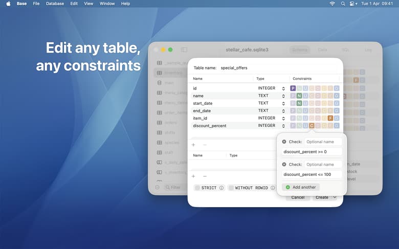 No need to fight with long-winded CREATE TABLE statements! You can add, edit and delete columns or constraints from a single sheet. Base has made the creating and maintaining of tables simpler than ever.