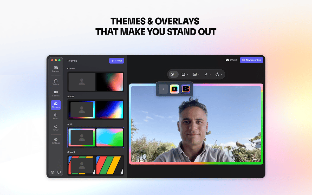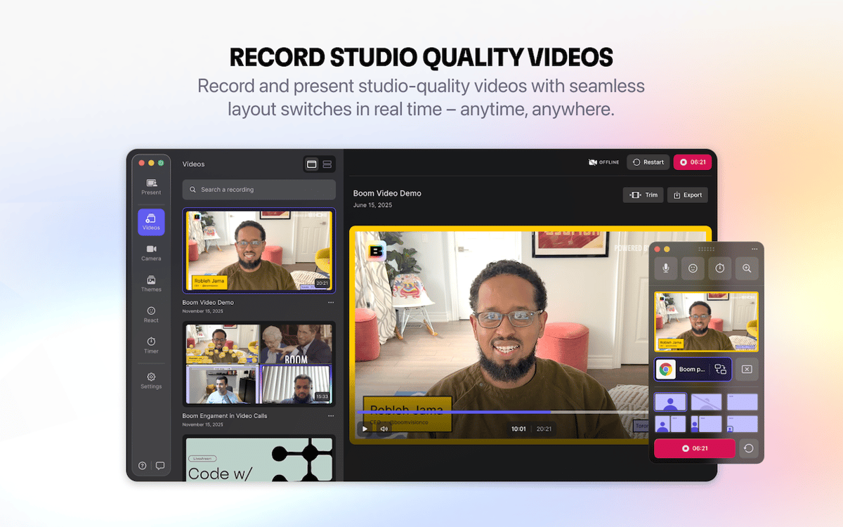 If you create courses, tutorials, or YouTube videos, Boom captures your screen and camera in the layout you choose. Switch between different views on the fly, add timers, overlays, and effects to keep your content polished and engaging. You can even connect your iPhone or iPad to present its screen in a clean device frame.