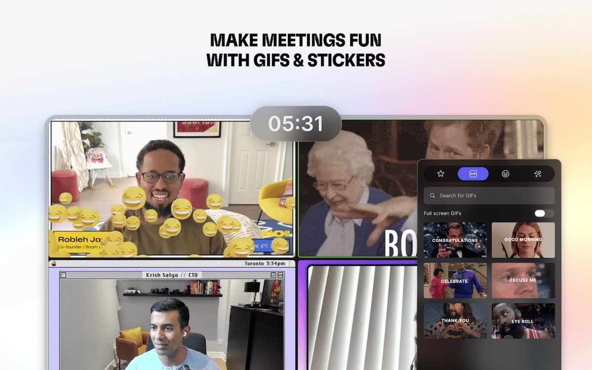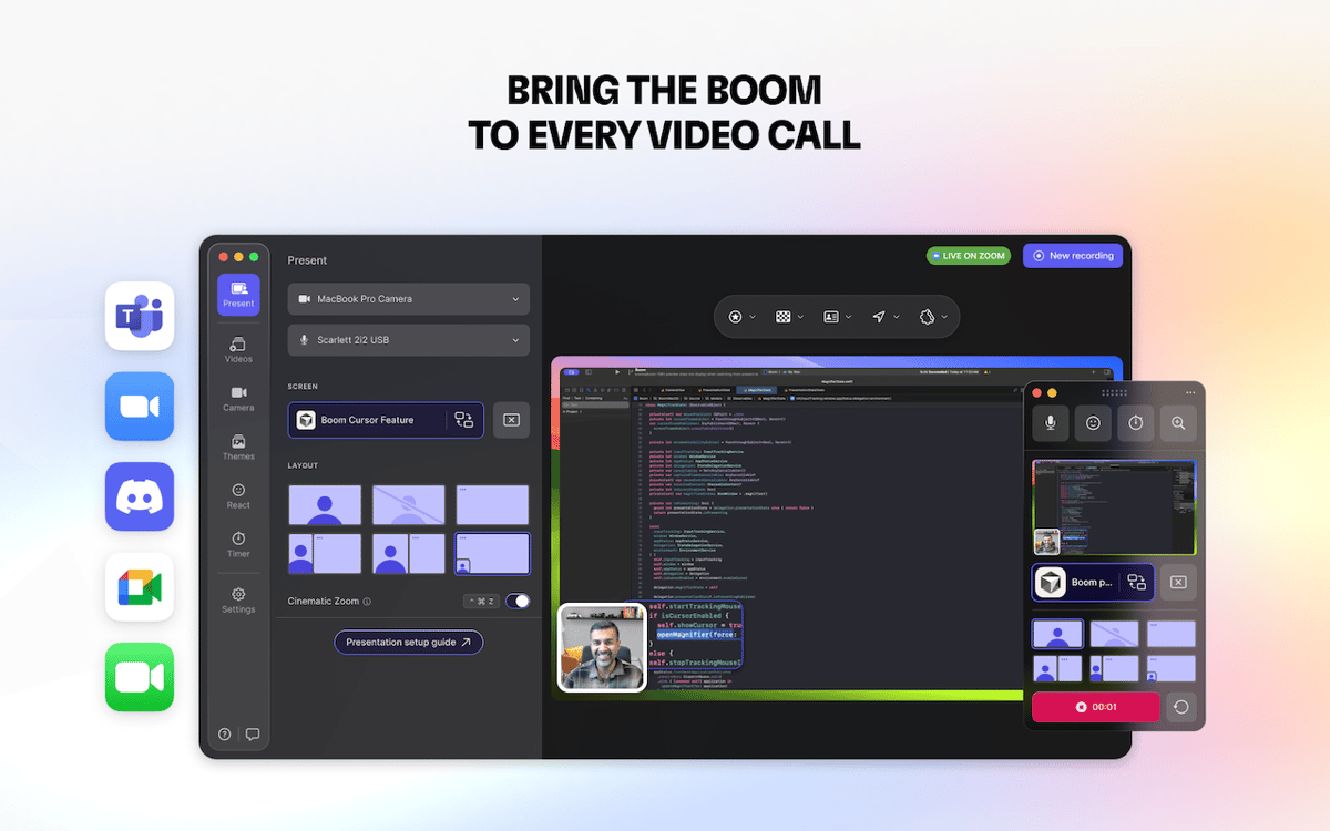 Connect Boom to your video calling app such as Zoom, Google Meet, or Teams. Boom will help you enhance your video and screen share with custom backgrounds, stickers, color presets, timers, and overlays. Choose from 6 layouts and switch them in real time, while cinematic zooming keeps the focus on what matters. Your slides and camera appear dynamic and professional, helping you hold attention effortlessly.