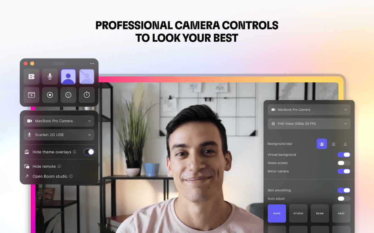Don’t have professional lighting but still want to look your best? Boom makes your existing webcam look noticeably sharper and more polished. Take full control with easy-to-use sliders to adjust brightness, contrast, saturation, highlights, shadows, hue, exposure, and temperature. Mirror your camera, adjust distortion, add a virtual background, and enhance your appearance with subtle skin smoothing.