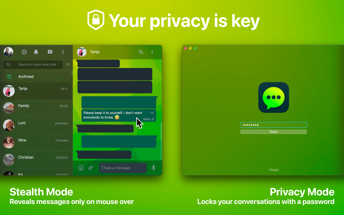 Got some chats which others should not see? Use Stealth Mode and chat bubbles will blur everything unless you move the mouse over them. Also, the app window can become almost transparent. Keep your secret communications unnoticed for others.