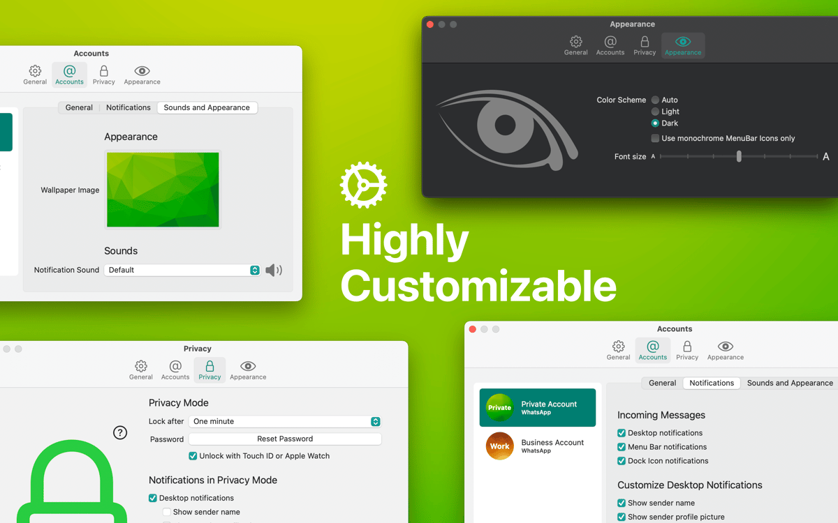 Make the app look the way you like. Set a custom wallpaper image, create keyboard shortcuts, choose the preferable way to open the window. It’s you who decide how your Chatmate for Whatsapp app should look and run.