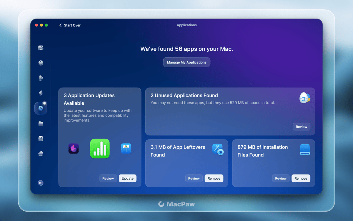 La désinstallation d'applications Mac peut se révéler difficile. Les déplacer vers la Corbeille ne libère pas vraiment votre Mac de tous les restes et fichiers associés. CleanMyMac X propose des modules pour supprimer les applications inutiles complètement et garder les applications nécessaires à jour.