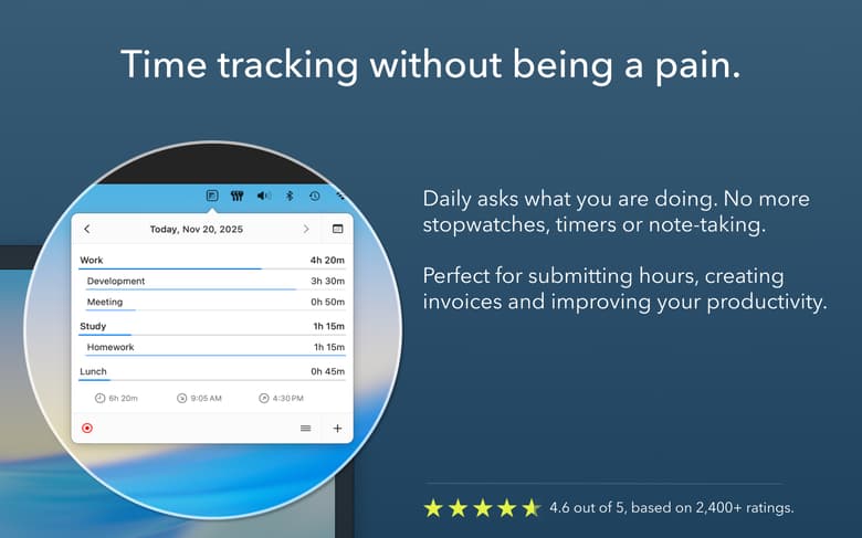 Daily doesn’t wait for you to remember to start recording your activity, it asks you automatically. Just type in what you are doing and be sure you don’t forget to track any part of your day with Daily’s automatic prompts. You can also choose to automatically apply an activity to pause the prompts.