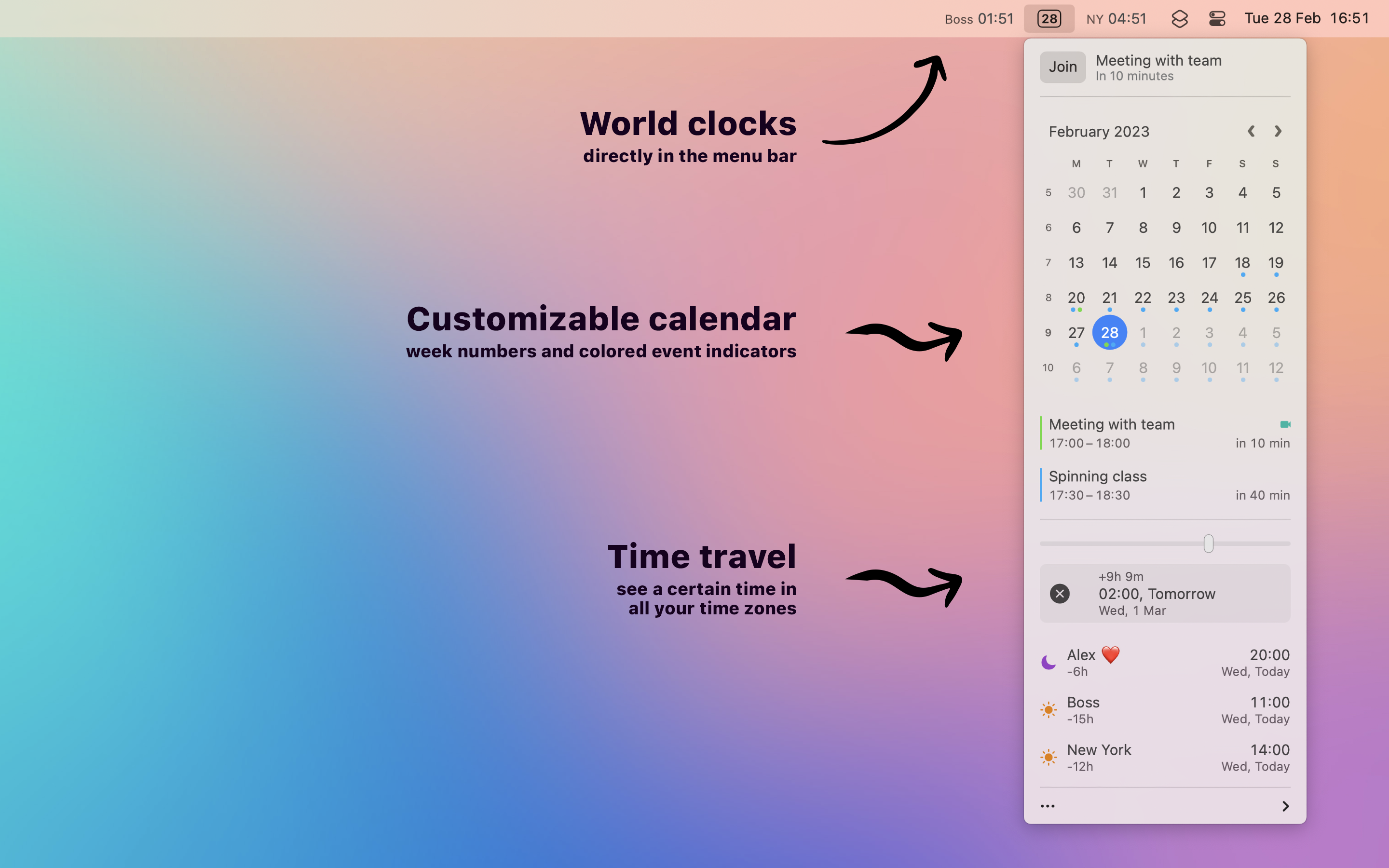 Add world clocks straight to your menu bar and check the time in your target time zone at a glance! Convert a specific time into a different time zone with a simple slider. Calculate time intervals in seconds with Dato’s handy time calculator.