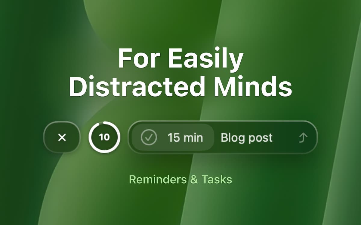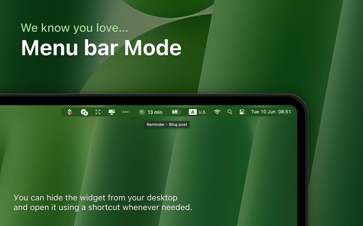 Reminders should be easy to set without interrupting your workflow. With DeskMinder², you can quickly add a reminder using a widget or from the menu bar, depending on what suits you best. DeskMinder also features quick built-in timers for 5, 10, 15, and 25 minutes.
