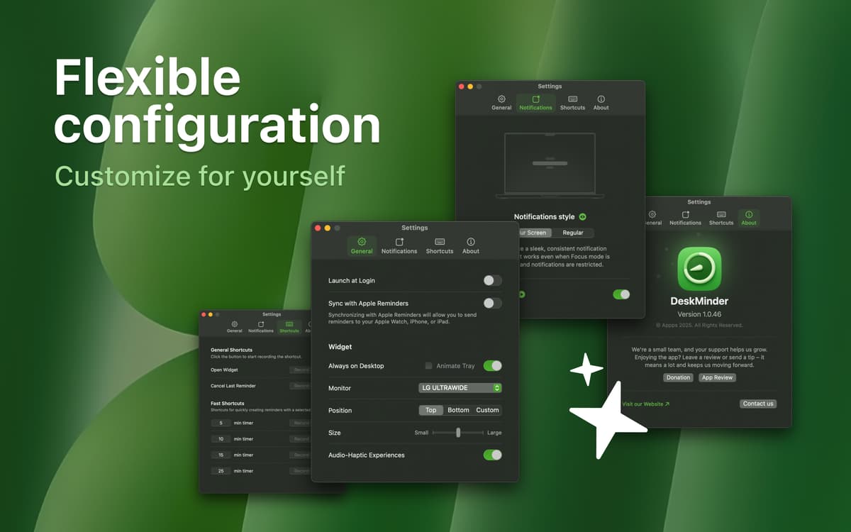 Tiny popups can be dismissed or overlooked. DeskMinder² takes over your entire screen with bold, full-screen notifications, making sure you can’t ignore or forget what’s important. You can also switch to regular notifications and adjust notification sound in Settings.