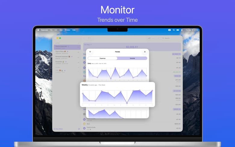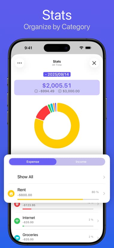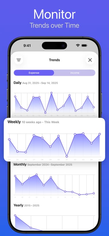 Just viewing what you spent throughout one day or week can be misleading as to where your money is really going. To help you view the whole picture, Expenses shows you trends of your spending over time. You can also go to the stats section to review spending by category.