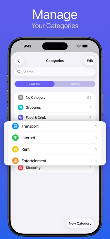 One of the most telling characteristics of your monthly and annual budget is what categories of expenses your money is being used for. Expenses app makes it easy to assign spending categories to each entry.