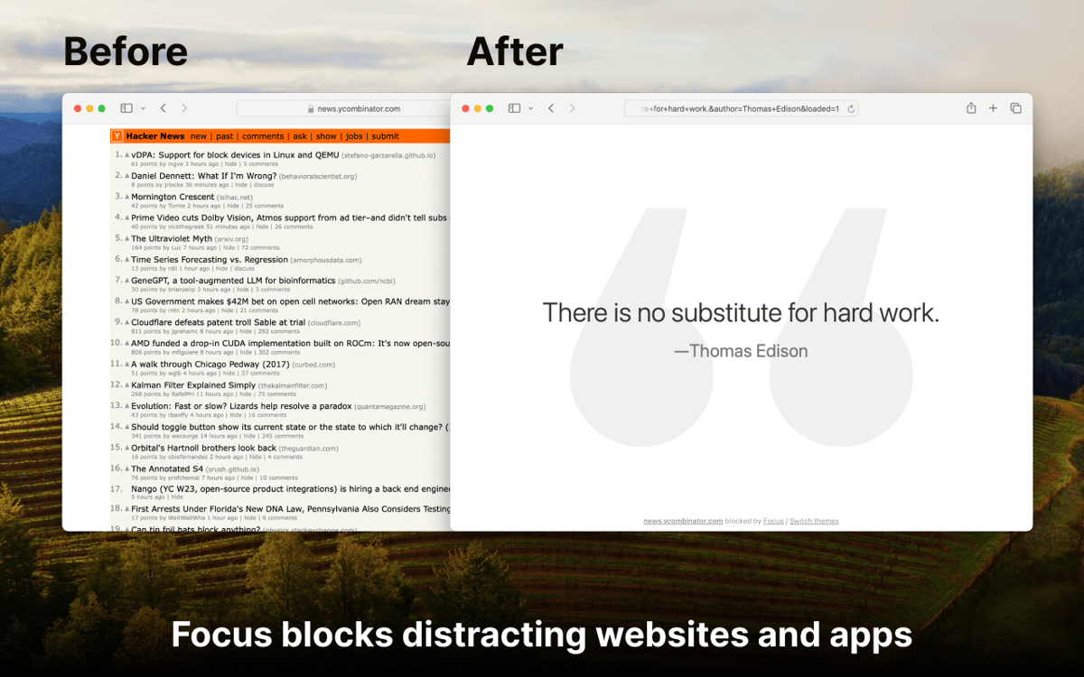 When you try to visit a blocked site or app, Focus displays a gray screen with an inspirational quote. Choose from a wide catalog of motivational quotes or set your own. More than just a blocker, Focus provides the words of wisdom you need to stay focused and motivated.