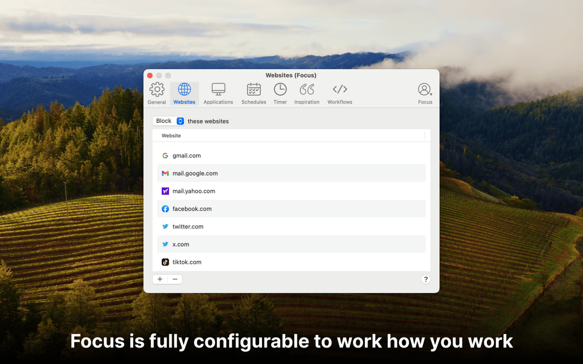 Focus ti consente di personalizzare le funzionalità di blocco in base alle tue esigenze. Puoi bloccare totalmente app e siti web come Facebook e Twitter o anche solo pagine specifiche. Hai scoperto una nuova pagina o app che ti fa distrarre eccessivamente? Aggiungila al tuo elenco di elementi bloccati completamente personalizzabile. Focus è sempre con te e ti permette di stabilire i limiti che vuoi importi.
