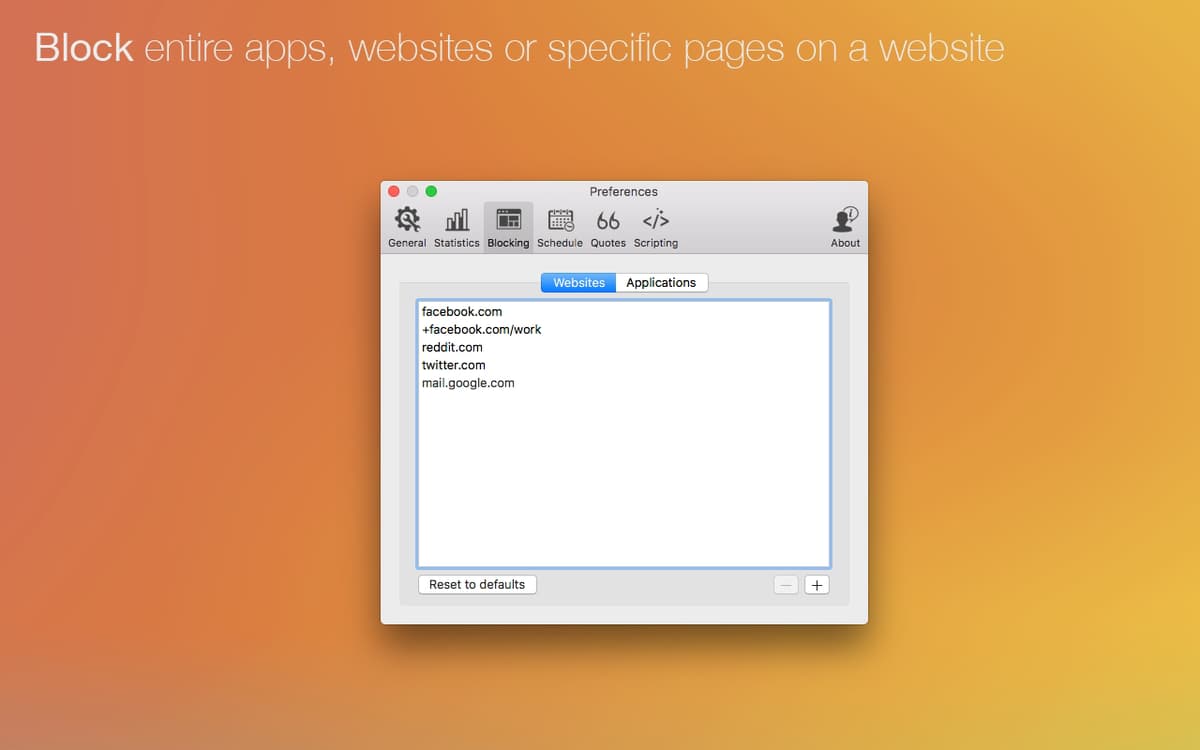 Focus lets you tailor its blocking features to your needs exactly. You can block entire applications, whole websites like Facebook or Twitter, or even specific pages. Find a new addictive page or app? Just add it to your fully customizable block list. Focus stays with you and lets you decide what your limits should be.