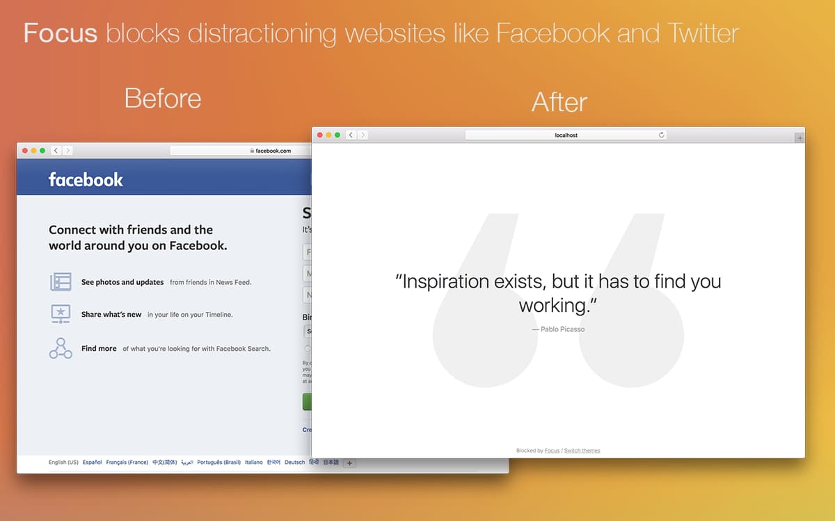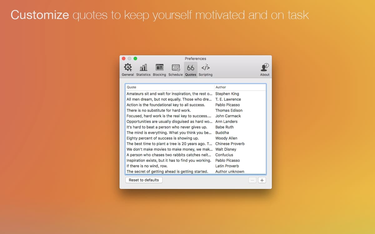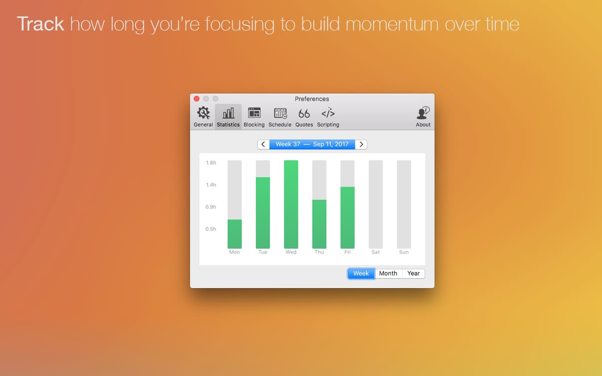 The internet is a lot of fun, but it can also be a huge time-sink. Focus helps preserve your productivity by blocking whatever sites or apps are sapping your attention. Working together with your browser or macOS, it’s in your corner in the fight against temptation. With a flexible but firm scheduling setup, you can build in time to unwind while still safeguarding your work hours. Plus, customizable inspirational quotes and a progress-tracking feature help you stay committed. The power is yours!