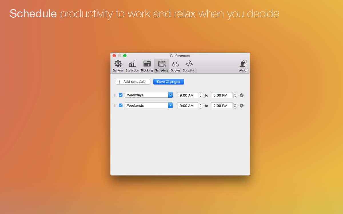 “All work and no play makes Jack a dull boy,” as the old saying goes. With the Schedule feature, you can decide when your page blocker should give you a break. Any good focus app gives you a chance to blow off steam — when you schedule with Focus, it’s easy to get back in the groove once your break time is over.
