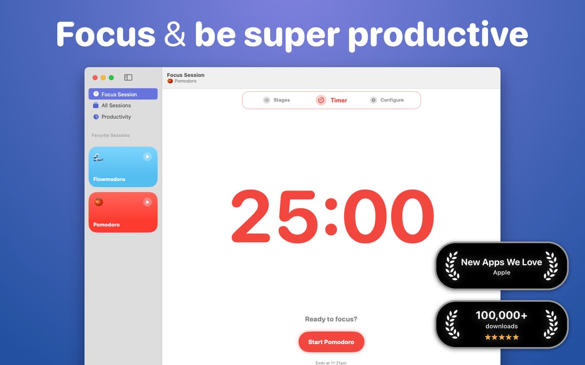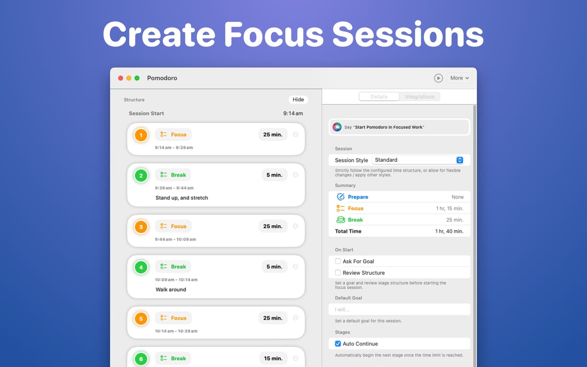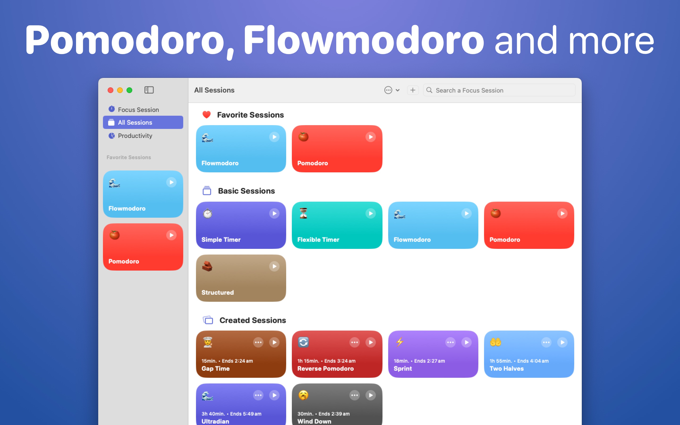 Analyze your focus session productivity sessions in the app's Productivity tab. Find the detailed breakdown of your session time, breaks, types of focused sessions, and more.