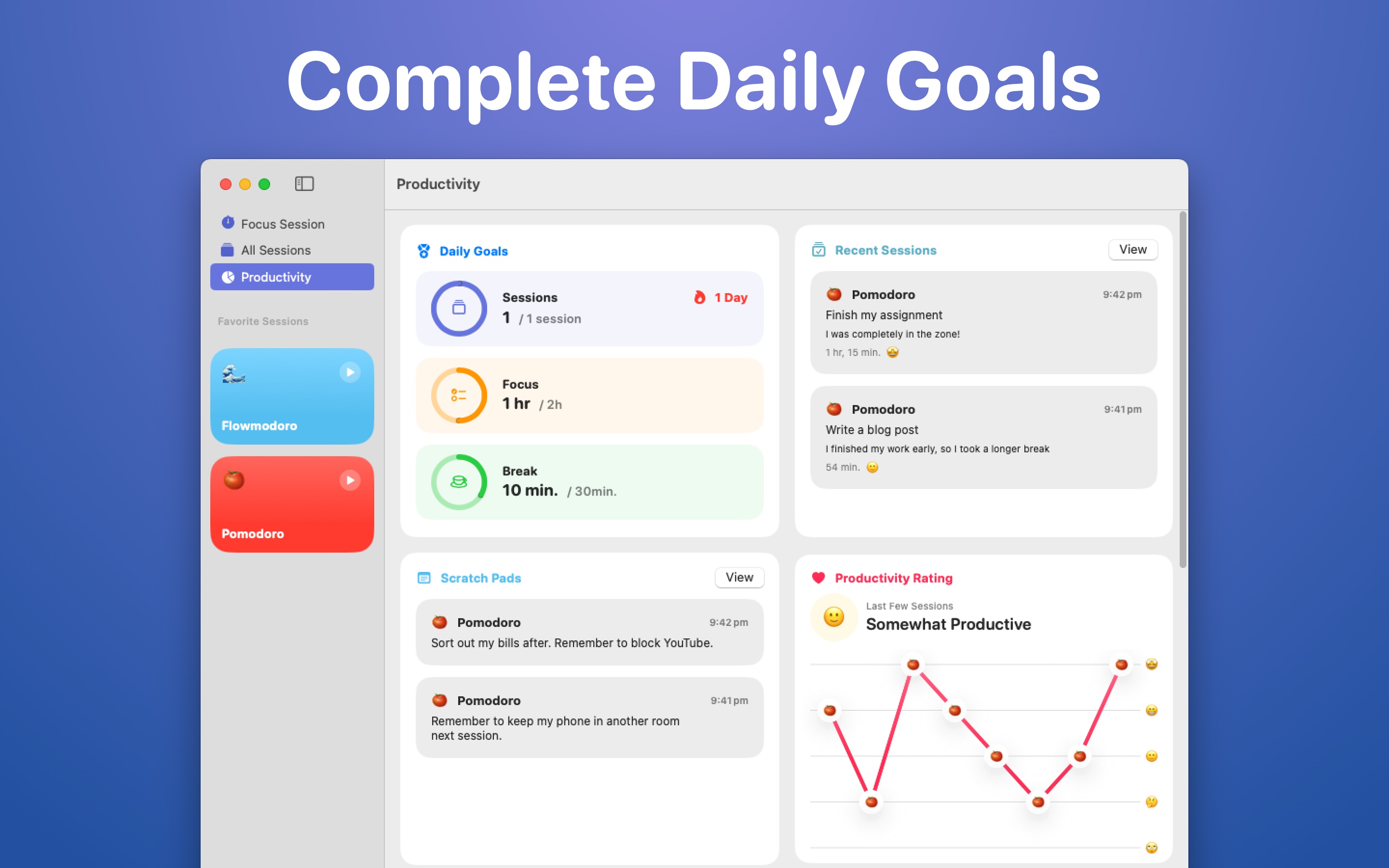 Whenever we try to focus, random thoughts, ideas, or unrelated to-dos tend to pop up in our heads. Use the app’s Scratch Pad to jot down thoughts you want to come back to after your focus session and let your mind refocus back to what you are doing without worrying about the distracting thoughts.