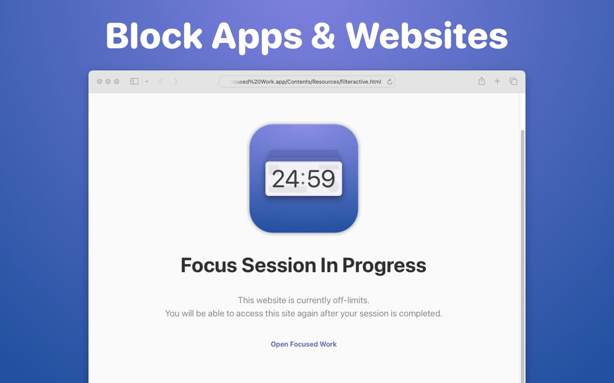 It only takes a moment of weakness to go from unwavering focus to mindless scrolling, so Focused Work enables you to block websites and apps. Create your custom Blocklist and keep your eyes on the prize with distractions tuned out for the duration of your focus sessions.