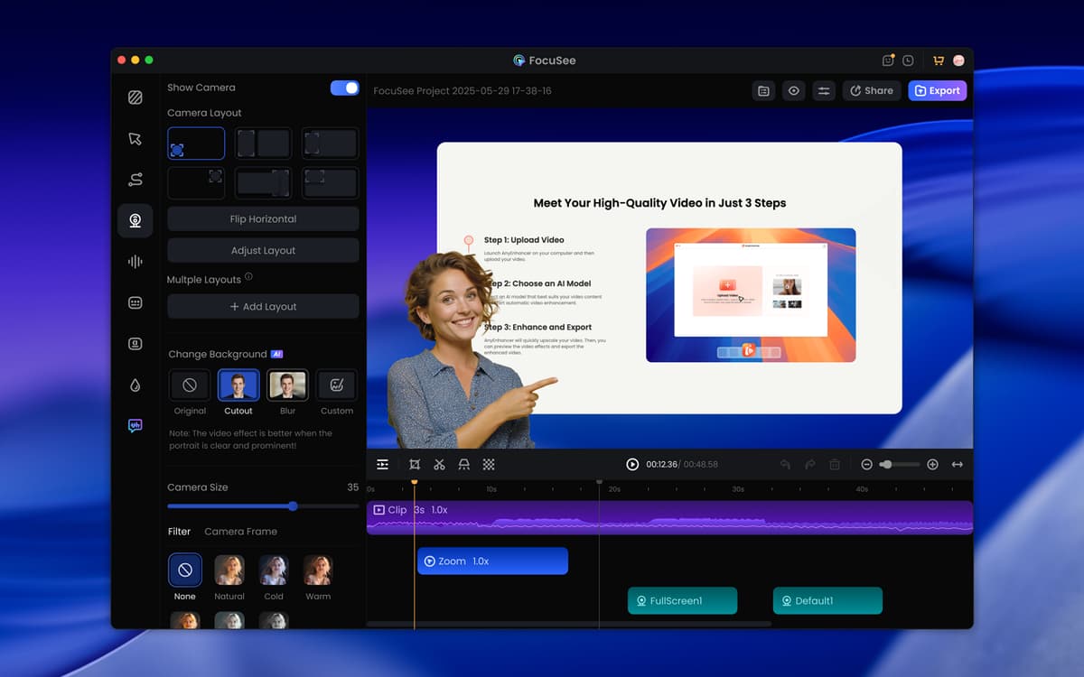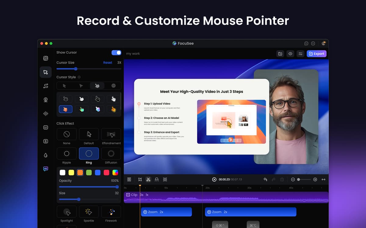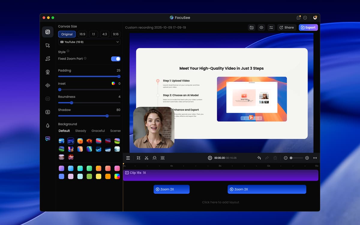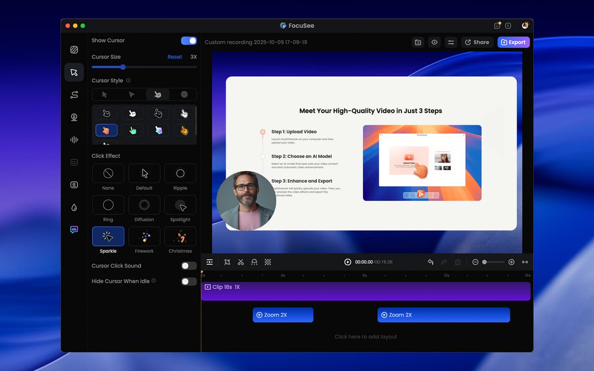 FocuSee lets you capture your screen, webcam, and voice simultaneously. You can record your entire screen, a specific window, or a custom area. Perfect for demos, tutorials, sales pitches, and more. The app automatically follows your cursor, highlights key points, and even adds smooth zooms. Want to display keyboard shortcuts during recording? You can do that too.