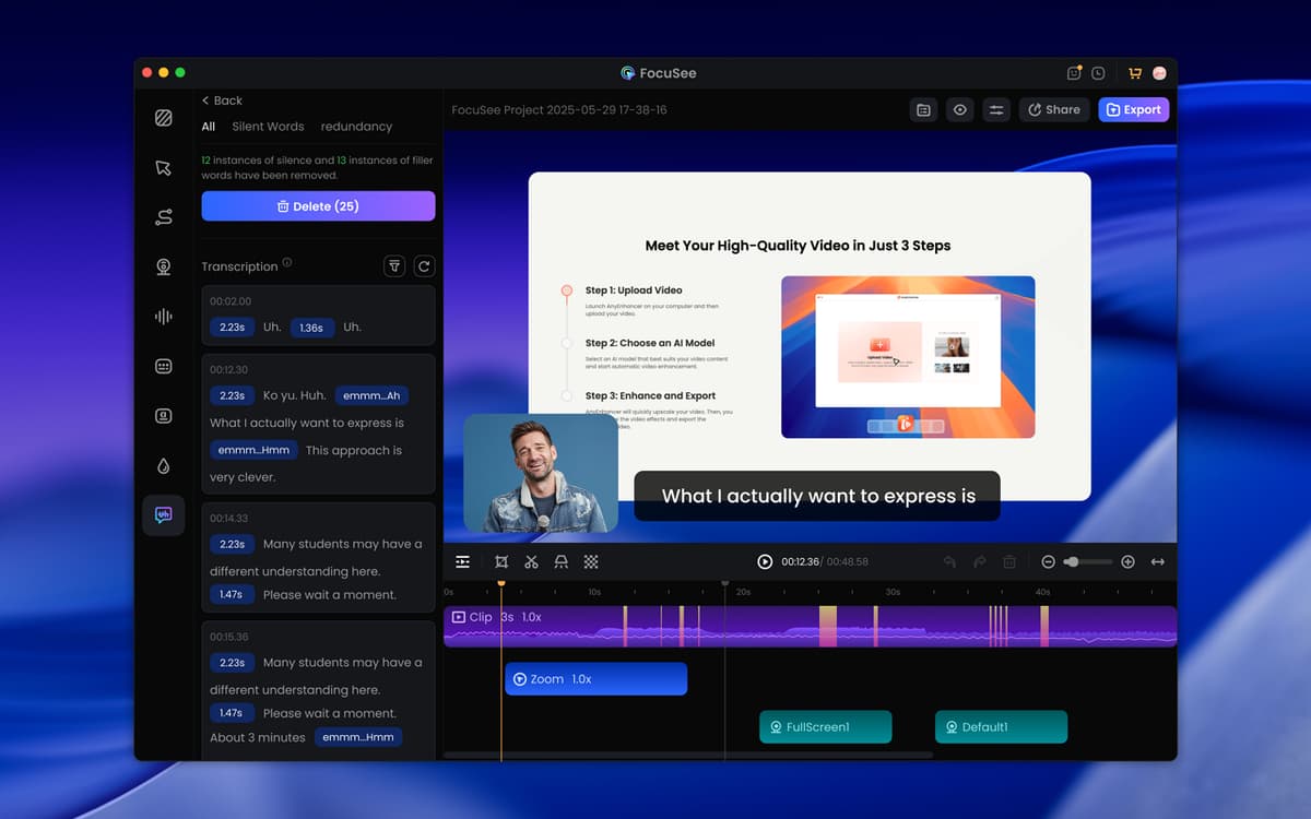 _With Setapp, you get the FocuSee Standard version._ Editing videos for tutorials, demos, or social media can take hours. FocuSee simplifies the process by automatically adding zooms, cursor highlights, backgrounds, and overlays to make your videos look polished. All you have to do is record, and FocuSee will transform your raw footage into professional-looking content quickly and easily.