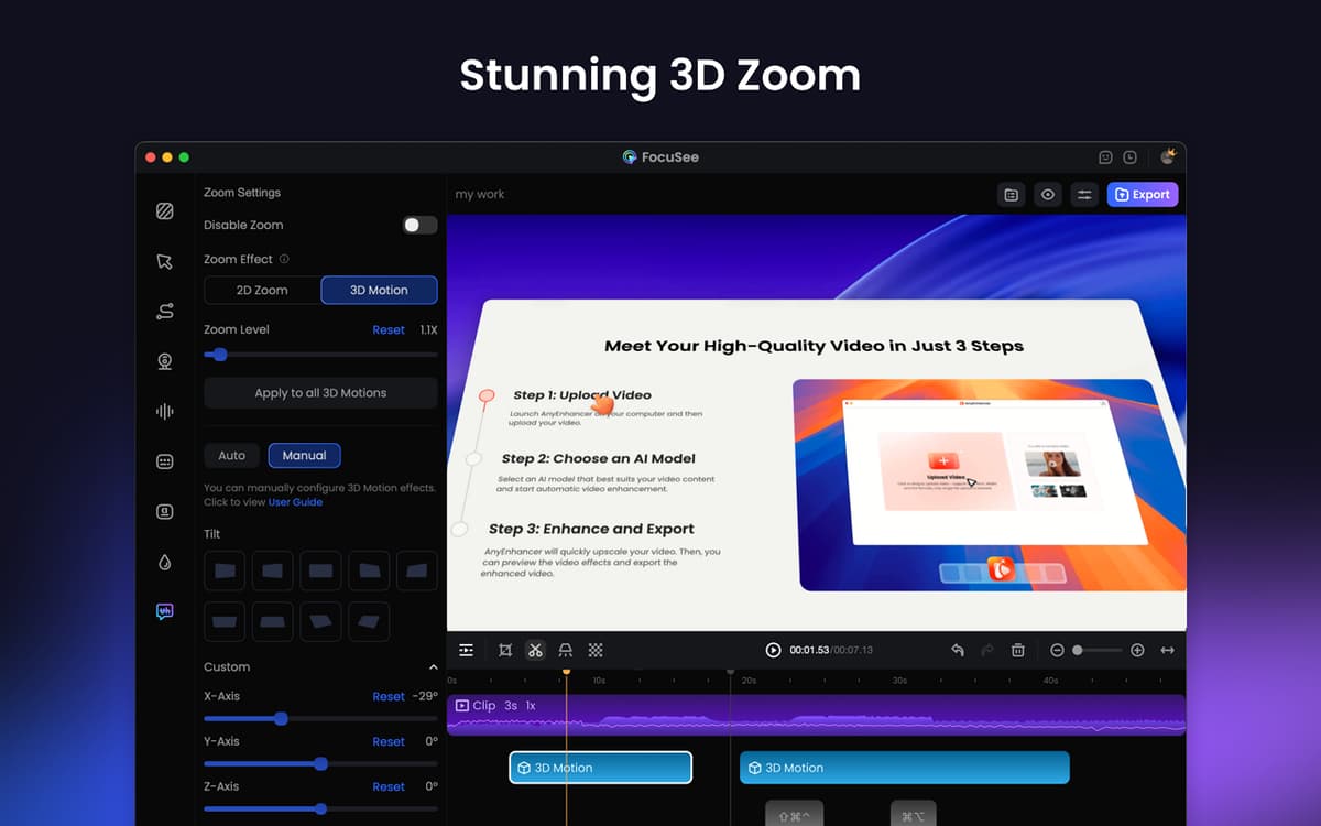With Setapp, you get the FocuSee Standard version. Editing videos for tutorials, demos, or social media can take hours. FocuSee simplifies the process by automatically adding zooms, cursor highlights, backgrounds, and overlays to make your videos look polished. All you have to do is record, and FocuSee will transform your raw footage into professional-looking content quickly and easily.