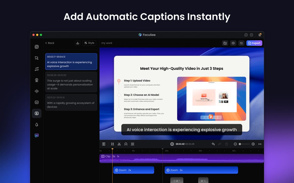 Use the teleprompter overlay to display your script on the screen so that you can stay on track and deliver videos that are smooth and confident. You can also enhance the audio volume and reduce background noise to ensure crystal-clear sound. Finally, add captions to help your audience understand your content better.
