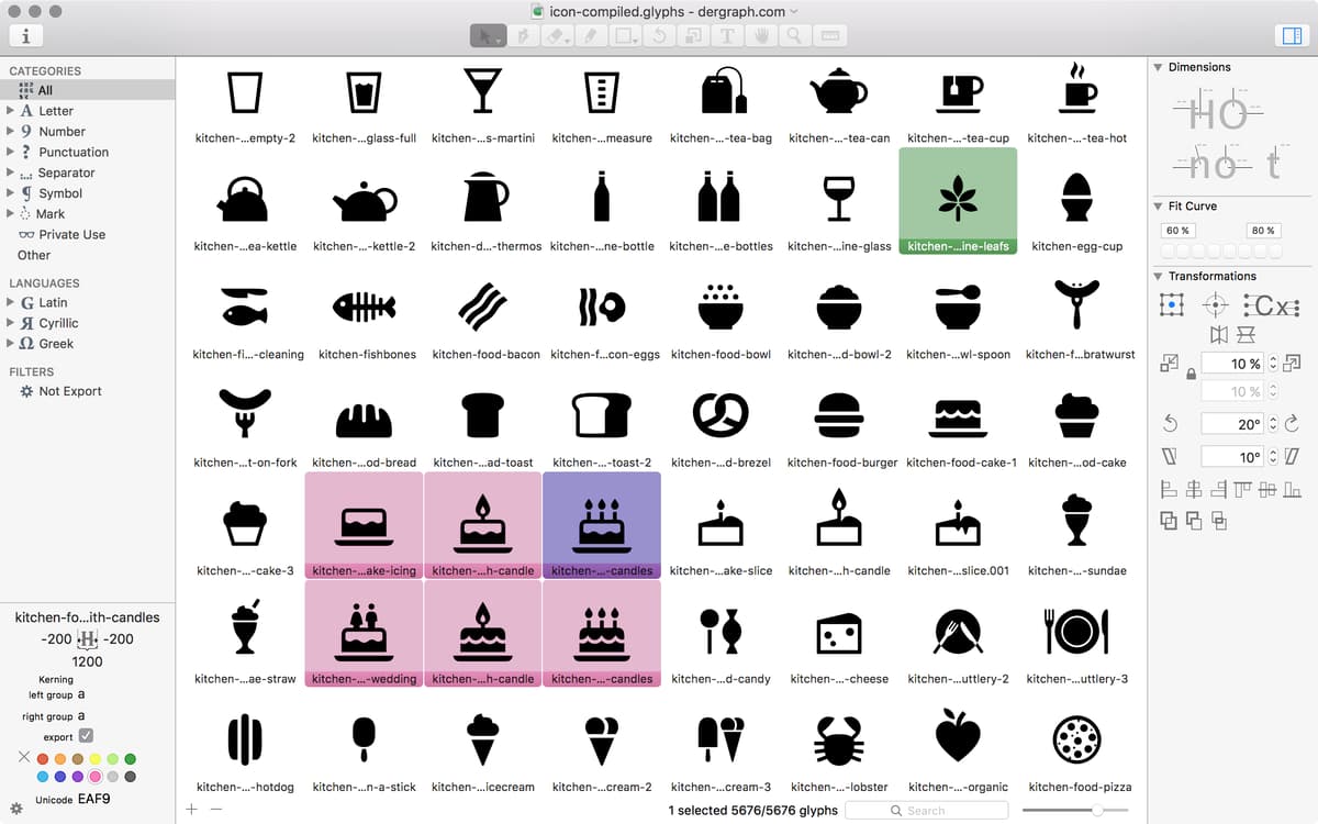 Create, edit, and preview the shapes of your letters in a word context. Easily shape your letters and symbols with Glyphs Mini’s industry-leading vector editing toolkit: precisely control curvatures, transform shapes, nudge curves, reconnect nodes, offset paths, and much more. Comfortably manage, batch-edit, search, and filter hundreds or even thousands of glyphs.