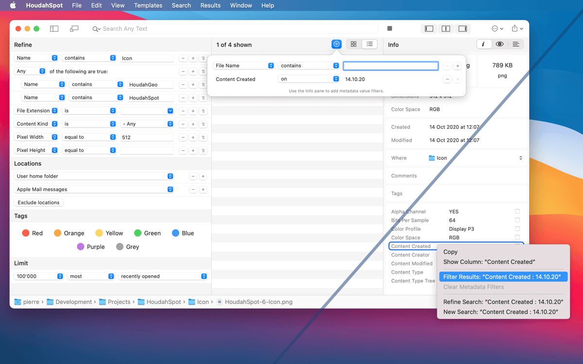 HoudahSpot is an app that enhances file search on Mac. Go beyond simple keyword search. HoudahSpot lets you combine various criteria, search across specific locations, preview files, save searches as templates, and more. Get your hands on hard-to-find files in seconds.