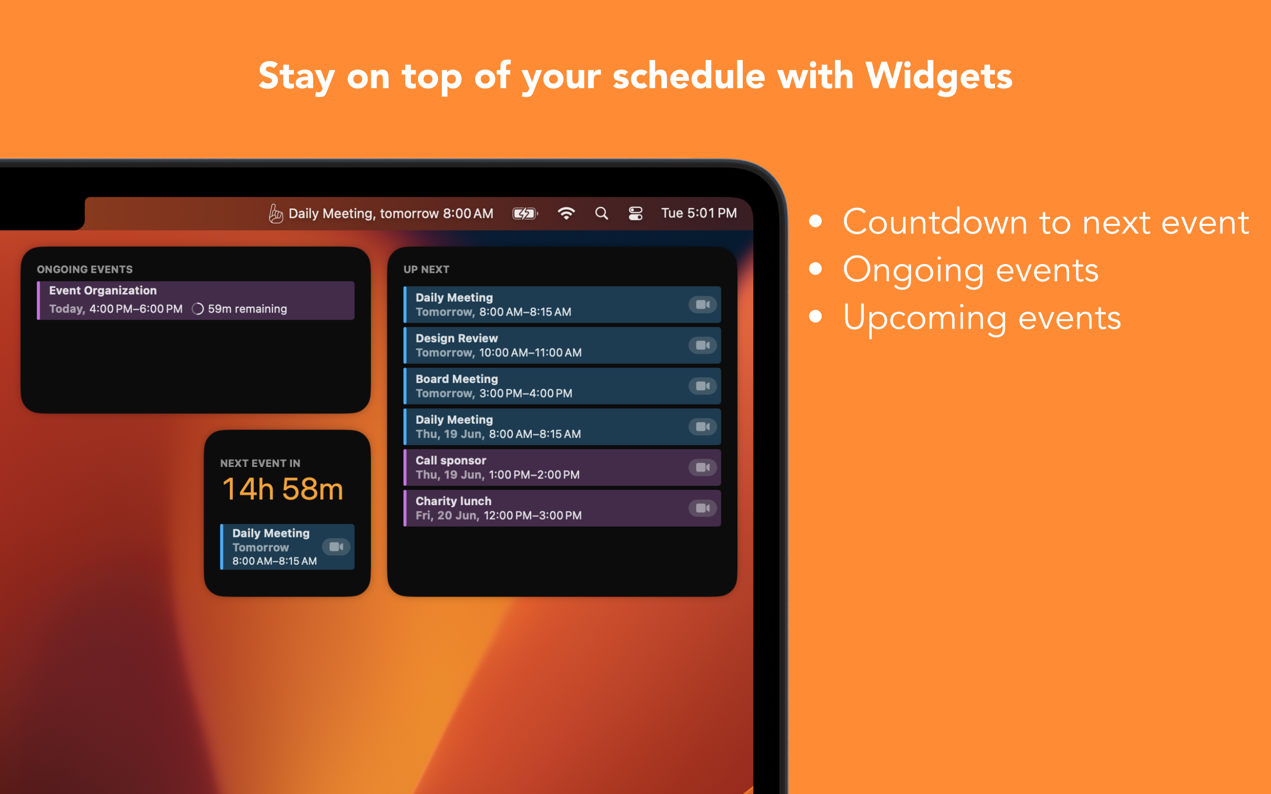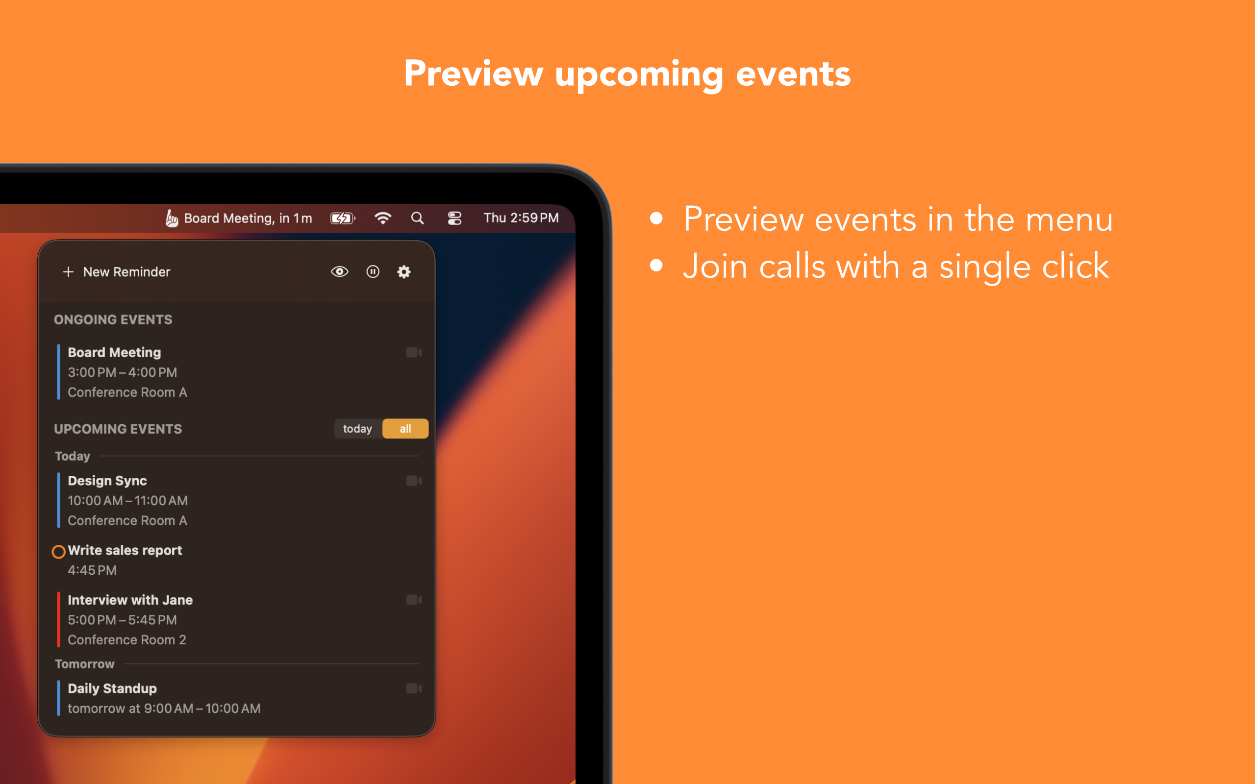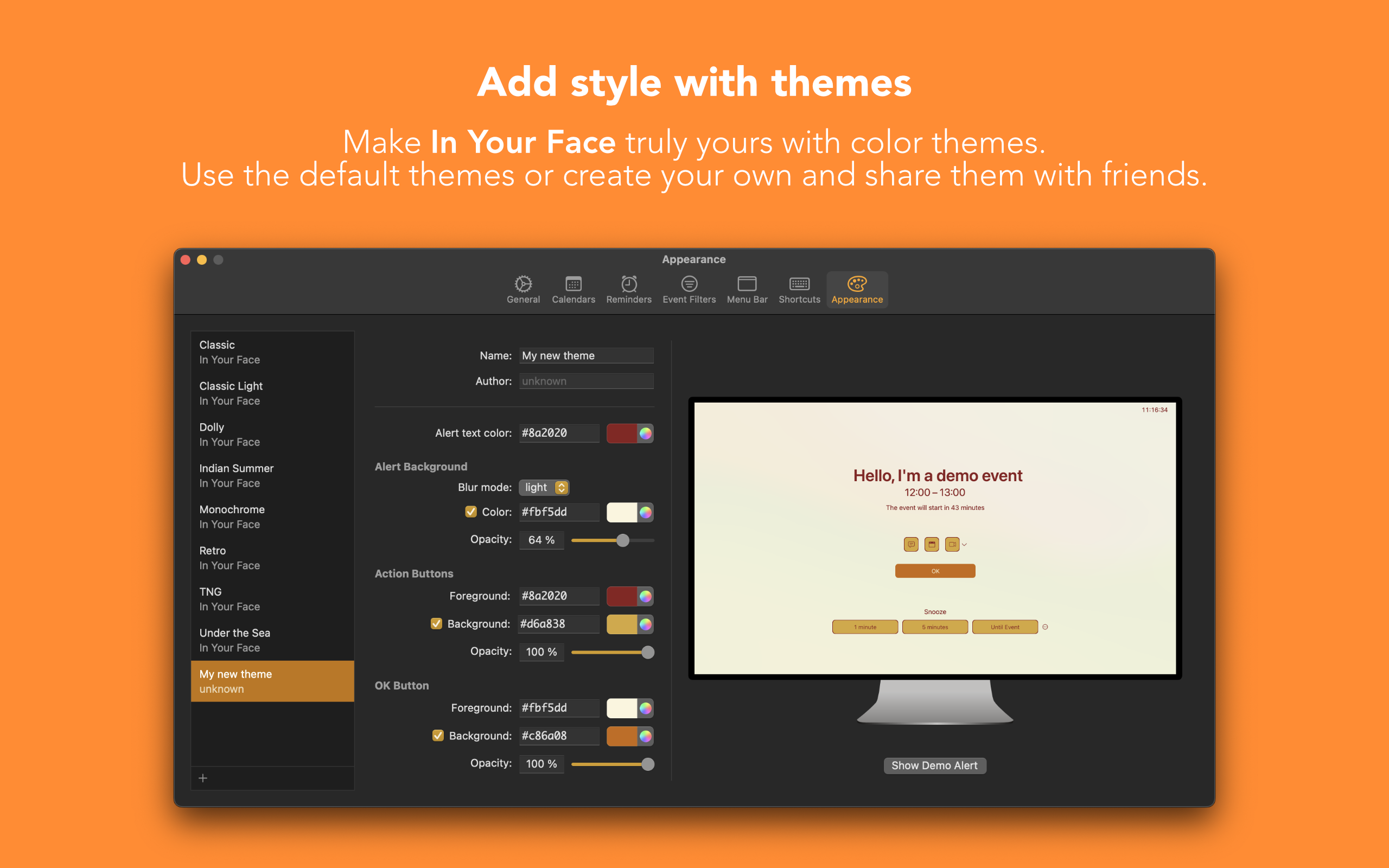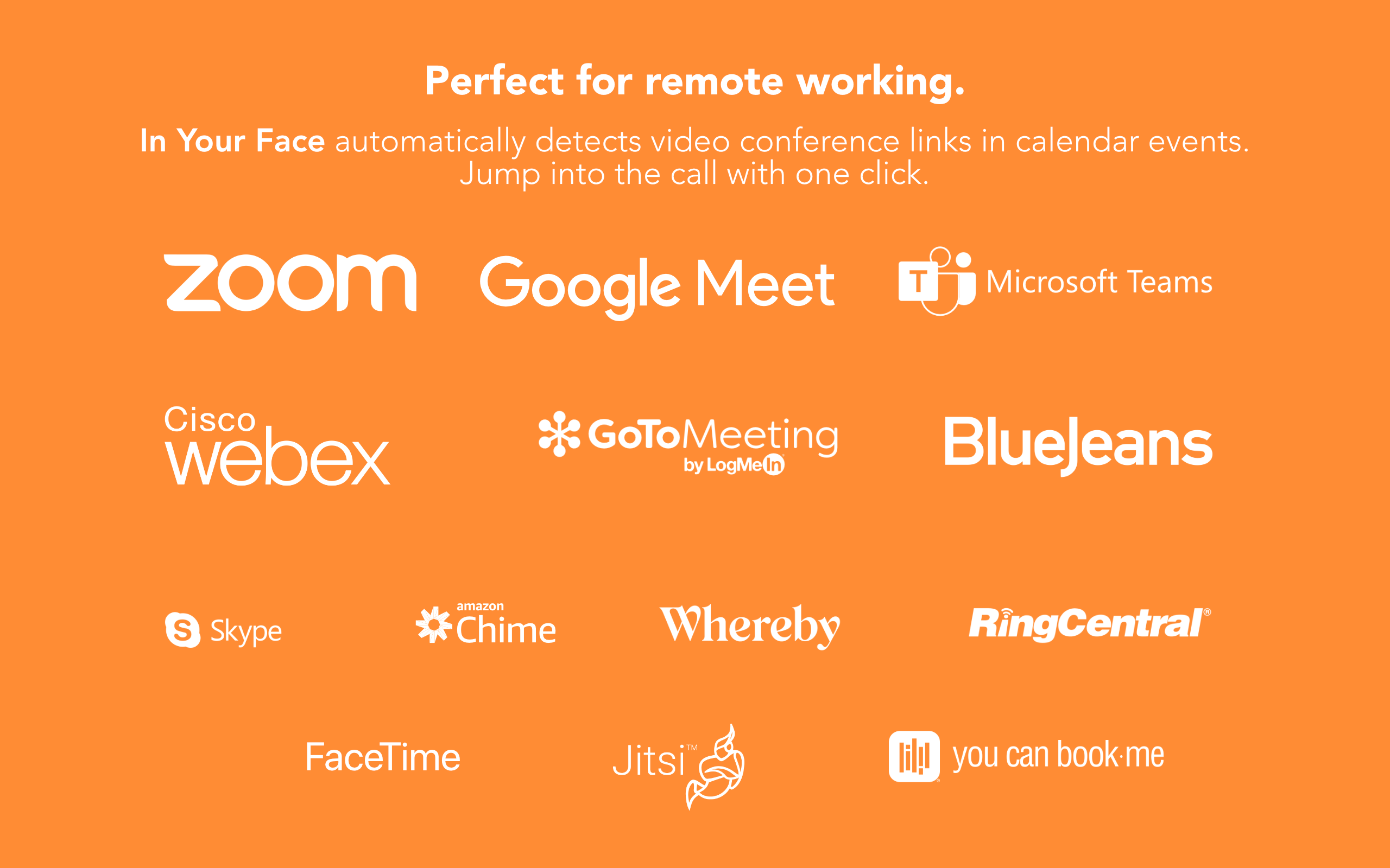 Be it a face-to-face event or a video conference, In Your Face will remind you. Stay focused on your tasks without having to check the time left before your event — In Your Face will alert you with a full-screen reminder. Plus, you can review your schedule directly from the menu bar!
