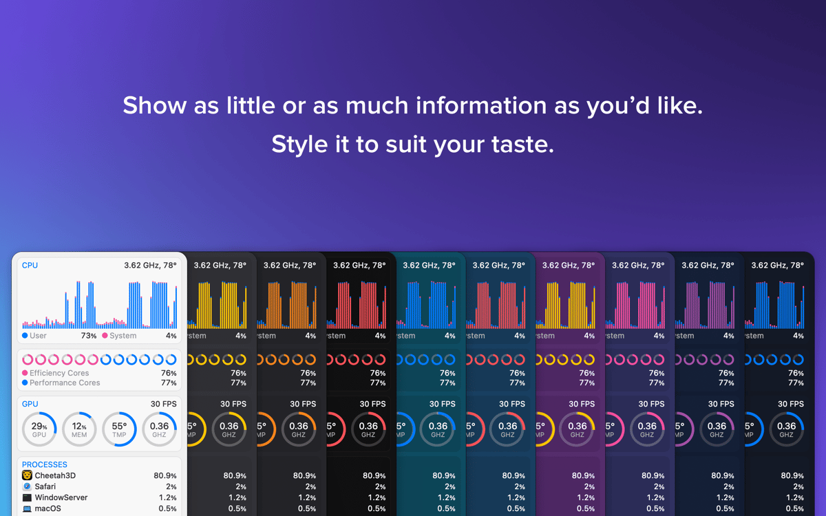 The most comprehensive Mac monitor to date. iStat Menus is a fully-equipped system data collector that lives in your menu bar and provides vital info about the key indicators. You get the stats on CPU load, memory load, disk usage/space, disk activity, temperature monitor, fan sensors, battery life and cycles, weather, and so much more. And, there’s a Dark Mode support. Of course, there is.