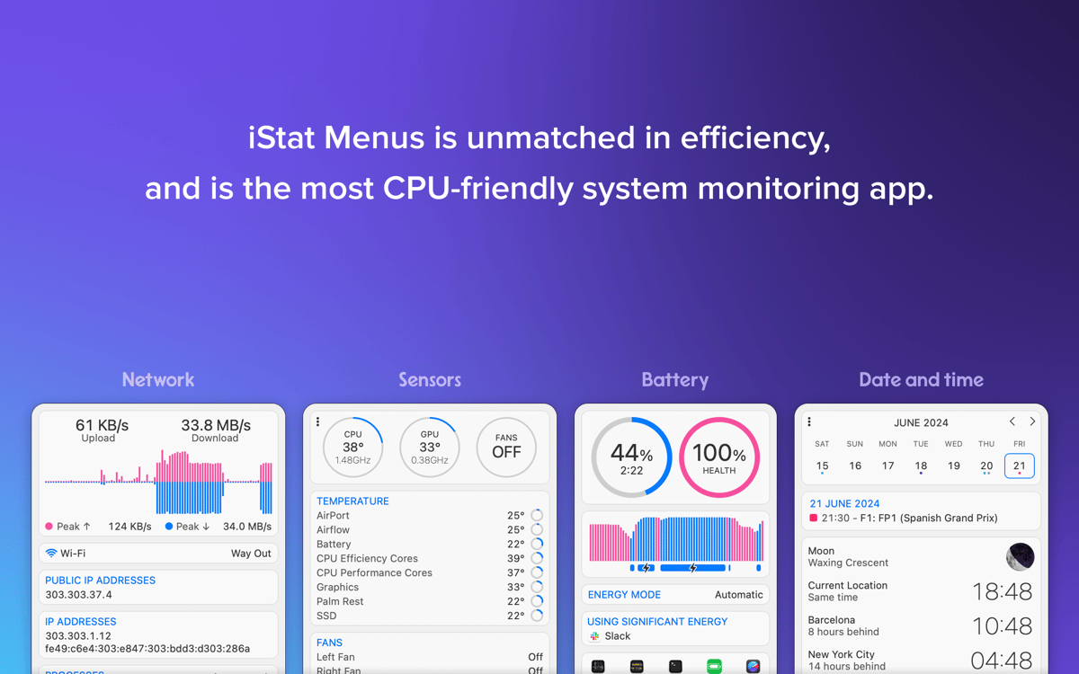 Most of daily needed info in super detailed form: date, time, and an extensive weather for Macs module with temperature calendar, moon phases, wind speeds, dew points, and more. iStat Menus also has a world clock to show you not just the time, but sunset and sunrise times all across the globe.
