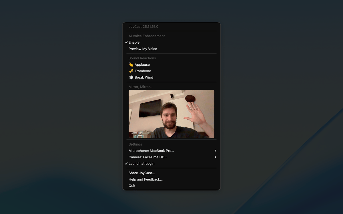 With a single setup, JoyCast removes background noise, polishes your voice with subtle enhancement, and keeps your audio consistent. Works seamlessly in Zoom, Google Meet, Teams, Slack, or any app that utilizes your mic. All you need to do is select JoyCast Microphone as an input device in the apps you use.