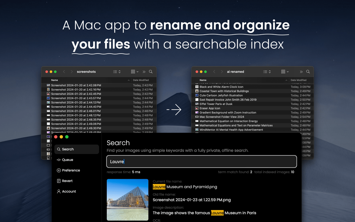 Rename images and videos in bulk with Keep It Shot. This AI-powered app generates meaningful names for your files that reflect the content of your screenshot for easier file management and search.