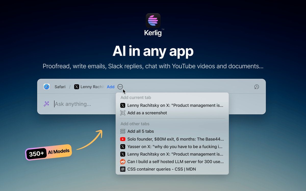 Kerlig is an AI writing assistant that lives in your Mac’s menu bar. Press a shortcut and it’s there — no browser tabs, no context-switching. Use it to proofread messages, draft replies, summarize documents, or run custom actions across any app. It works with 350+ models from OpenAI, Anthropic, Google, and more using your own API keys.