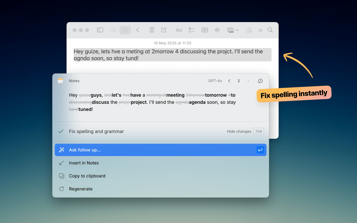 Kerlig stays out of the way until you need it. Hit a keyboard shortcut and it pops up right where you’re working — whether that’s Mail, Slack, Notion, or anything else. Fix grammar, improve a message, or draft a reply without opening a single browser tab. It fits right into how you already work on your Mac.