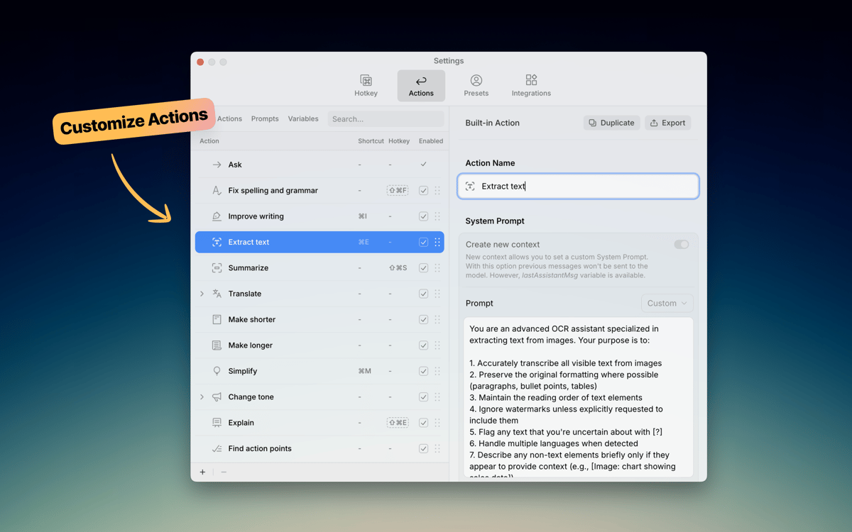 Kerlig comes with handy built-in actions like proofreading, summarizing, and translating. But the real power is making your own. Create custom prompts for things you do often — writing Jira tickets, converting code, generating social posts — and trigger them instantly from the shortcut menu. Your workflows, your rules.