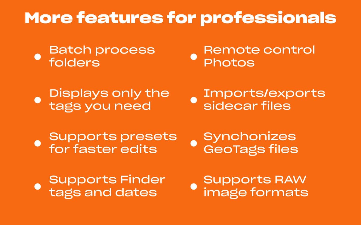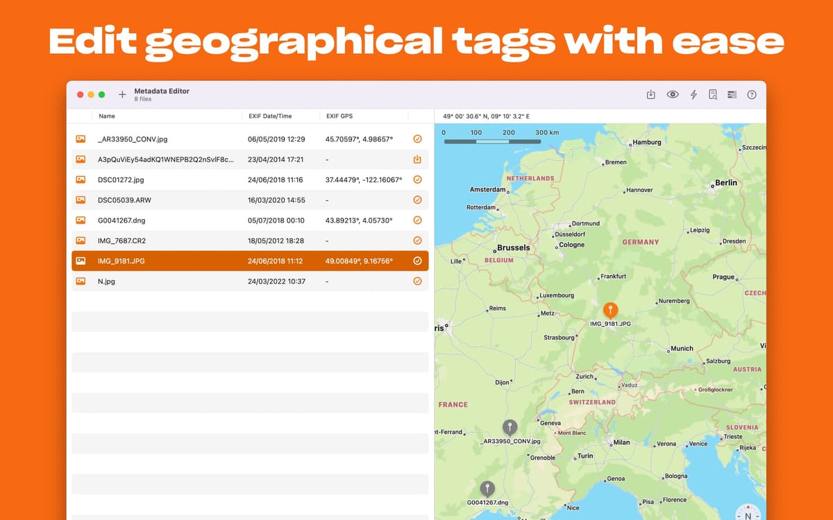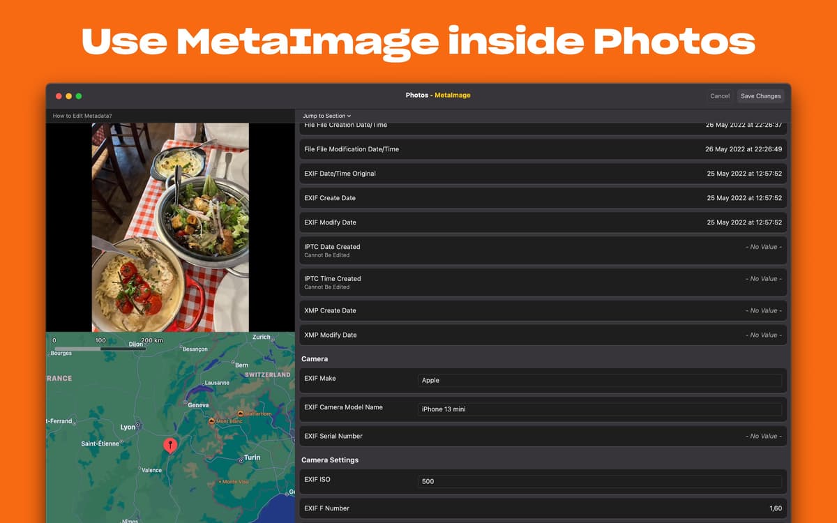 Let MetaImage take care of your images metadata on Mac. Instead of manually editing data for every picture in the Photos app, you get a completely automated flow. Handle every tag format — including EXIF, IPTC, and XMP. Flexibly add GPS coordinates. Create presets and apply the same changes to multiple pictures.