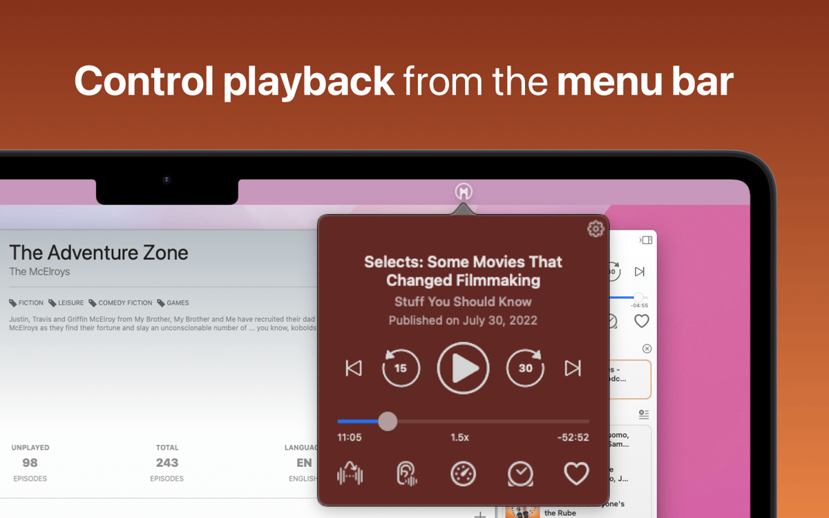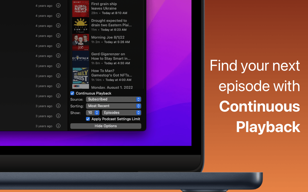 La tua playlist attuale è sempre a portata di mano nella barra laterale “Now Playing”, sulla destra. Guarda quale puntata è in riproduzione e quale sarà la prossima, gestisci le tue playlist trascinando e rilasciando o usa la selezione multipla. La barra laterale può essere compressa, permettendoti di passare in qualunque momento a una modalità compatta.