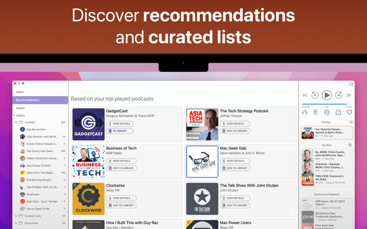 Mimir è una potente app per computer desktop che ti consente di trovare, organizzare e ascoltare le puntate dei tuoi podcast preferiti da un unico posto. È un po' come Spotify per i podcast. Cura le playlist, ricevi consigli personalizzati e goditi un'esperienza di ascolto incredibile con l'omissione del silenzio, la riproduzione continua e altro ancora.