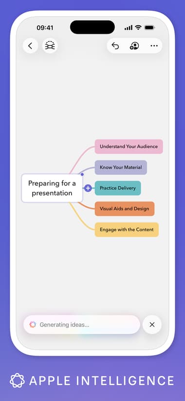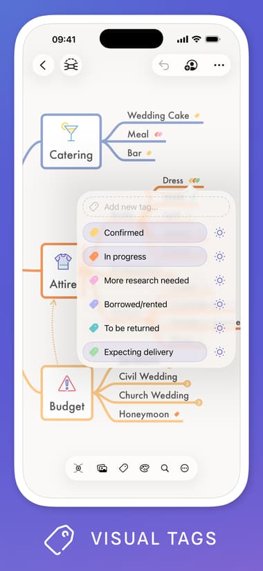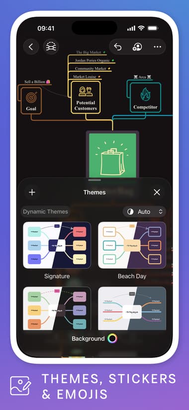 Your mind maps don’t have to look boring or black and white. MindNode Next offers many options to beautify your maps. You can color‑code nodes to represent different categories, apply themes for a polished look, and add visual tags or stickers to give quick context. There are over 250 built-in stickers like icons for ideas, deadlines, or priorities that help make your maps more engaging and easier to understand at a glance.