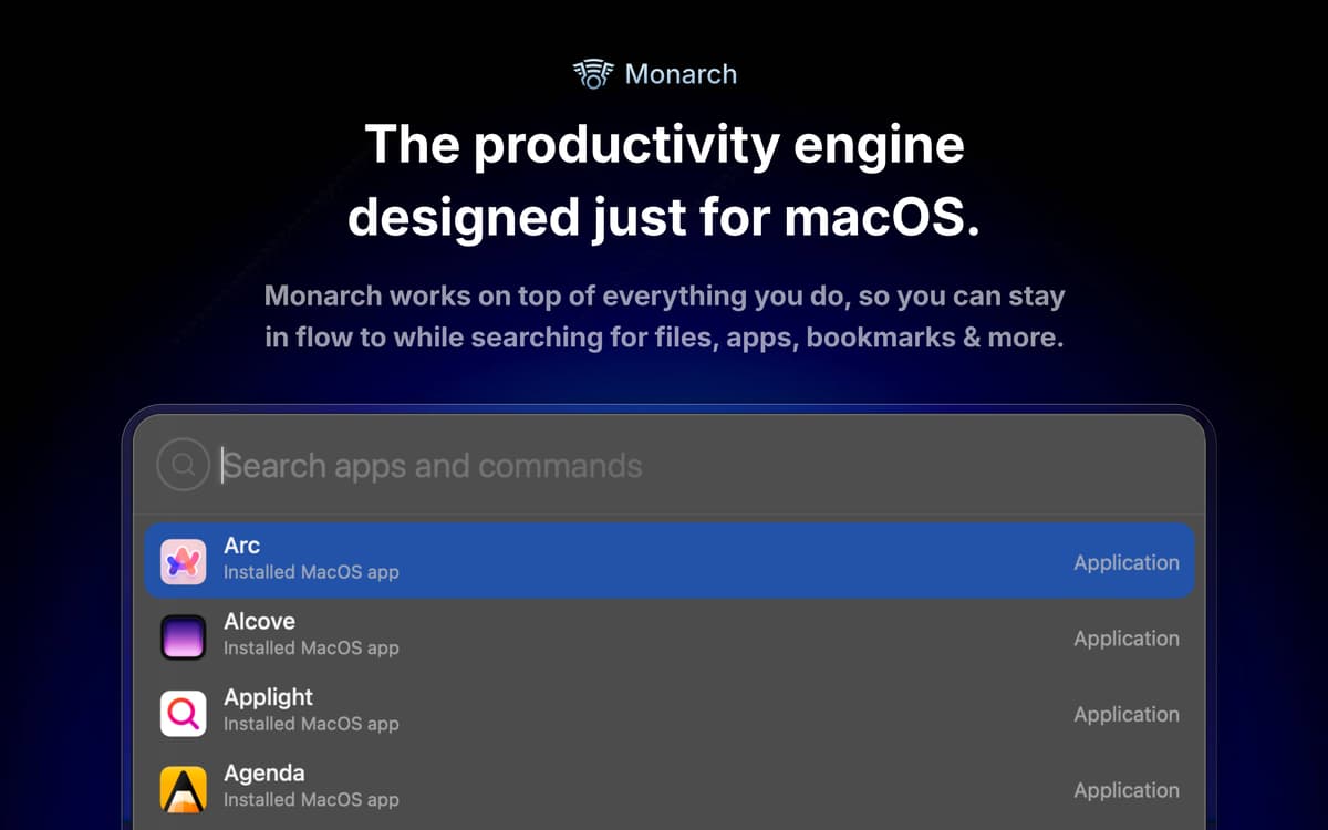 Monarch is a modern command center for Mac. It brings your apps, files, clipboard, notes, bookmarks and more into one powerful launcher built from the ground up for speed and power, so everything you need is always a keystroke away.