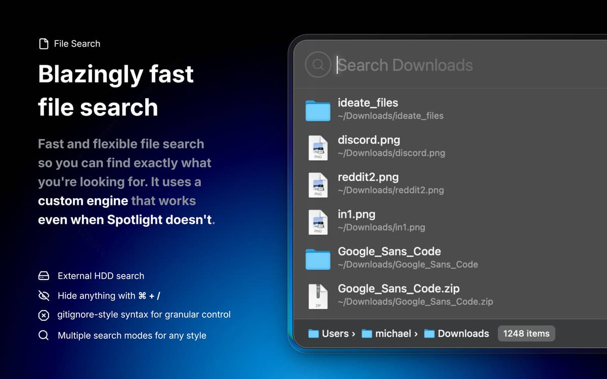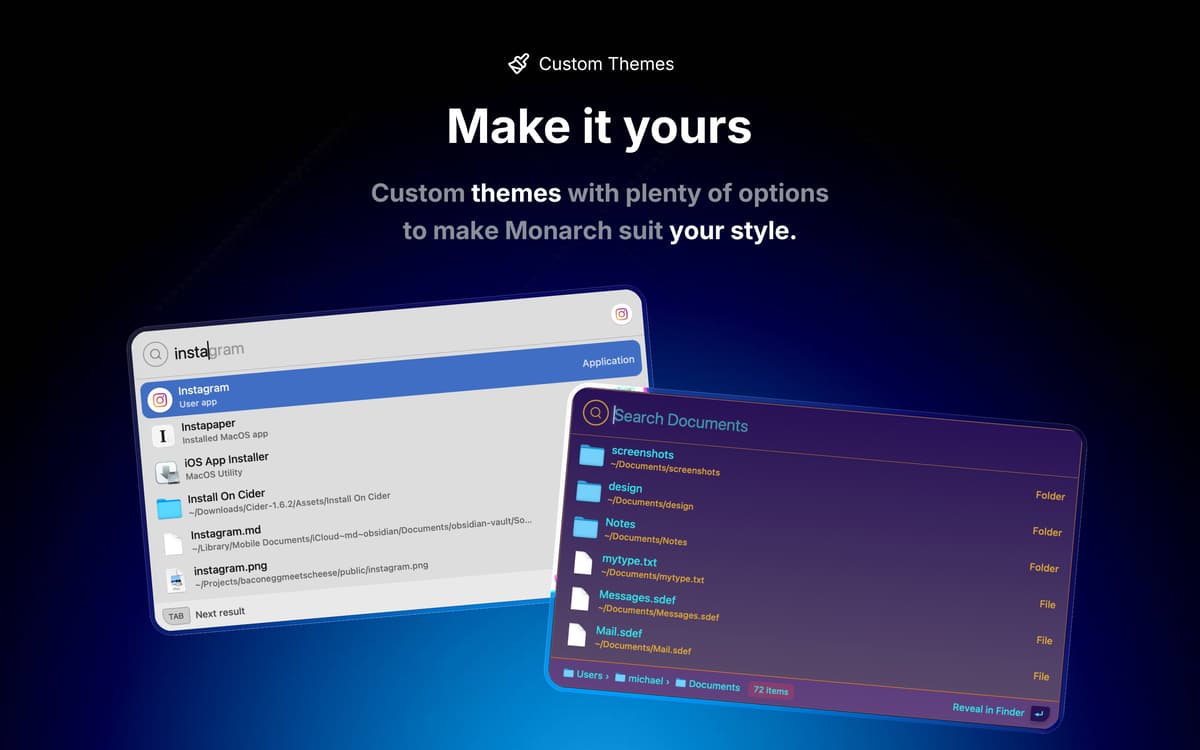 Hit your hotkey and start typing. Monarch finds your apps, files and folders more reliably than any launcher because it uses its own custom index, so it works even when Spotlight doesn't.