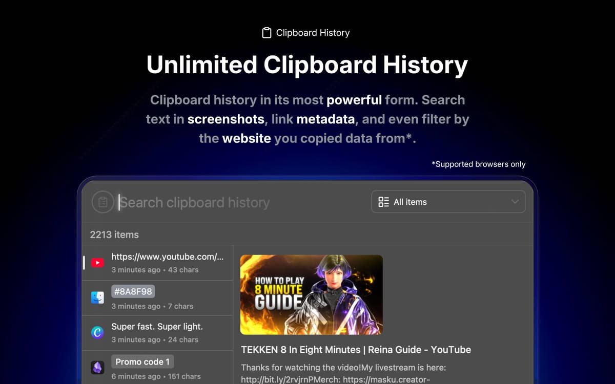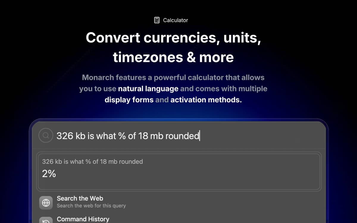 Open Monarch and press tab to change functions: filter specific apps and sites from your clipboard, calculate with natural language, measure contrast between two colors, and create search results based on your exact workflow needs, and much more.