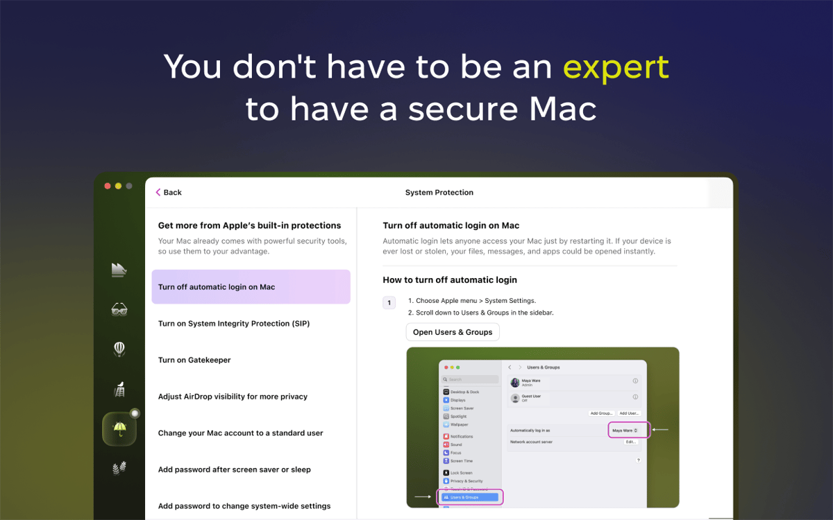 Set up all Apple security tools without taking your Mac to the Apple Store or searching for tutorials online. Moonlock has it all ready for you. Follow its step-by-step instructions to turn on Mac settings that keep you safe — and turn off those that put you at risk.